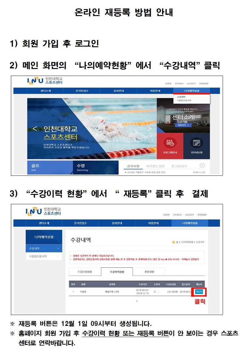 온라인 재등록 방법 작성자 관리자 작성일 2018년 11월 30일 14시 20분 5초 조회 1,727 온라인 재등록.jpg [ Size : 215.69KB, Down : 1,033 ] 미리보기 다운로드 목록보기