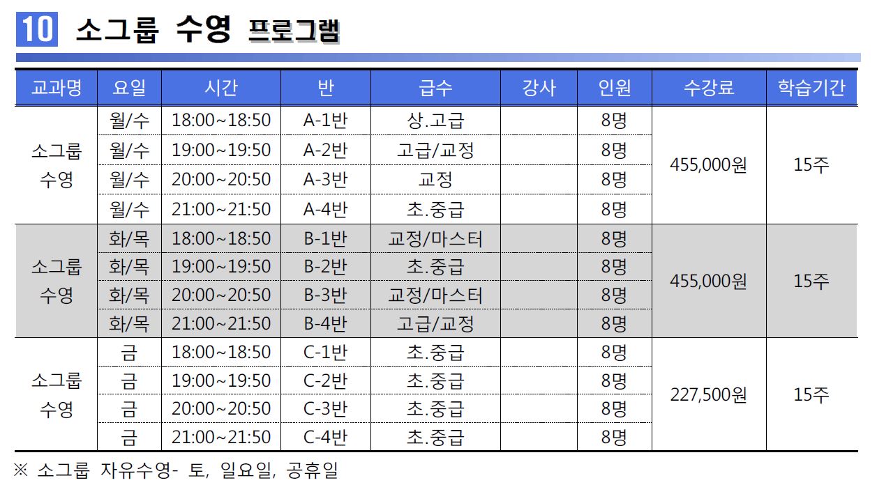 평일 어린이 소그룹 수영 가을학기 15주 안내 작성자 관리자 작성일 2019년 8월 9일 21시 51분 13초 조회 1,645 소그룹.JPG [ Size : 166.8KB, Down : 1,377 ] 미리보기 다운로드 평일 어린이 소그룹 수영은 8명 정원으로 하여 비슷한 수영 수준의 아이들이 강습을 하는 강좌입니다.신규 접수 희망자는 필히 해당 관리 강사에게 접수 신청 전 사전 통화 상담 후 등록하시기 바랍니다.담당자: 공재호 010-2649-0152 목록보기