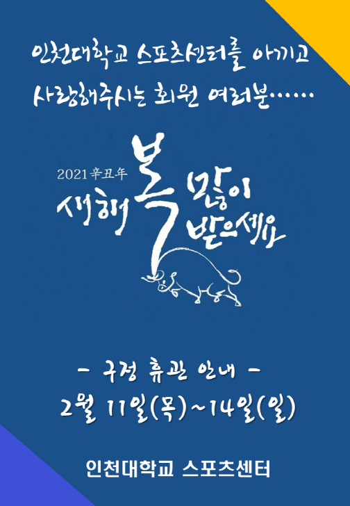 구정 연휴 휴관 안내 작성자 관리자 작성일 2021년 2월 10일 14시 20분 11초 조회 1,135 [크기변환]슬라이드1.PNG [ Size : 178.86KB, Down : 1,409 ] 미리보기 다운로드 목록보기