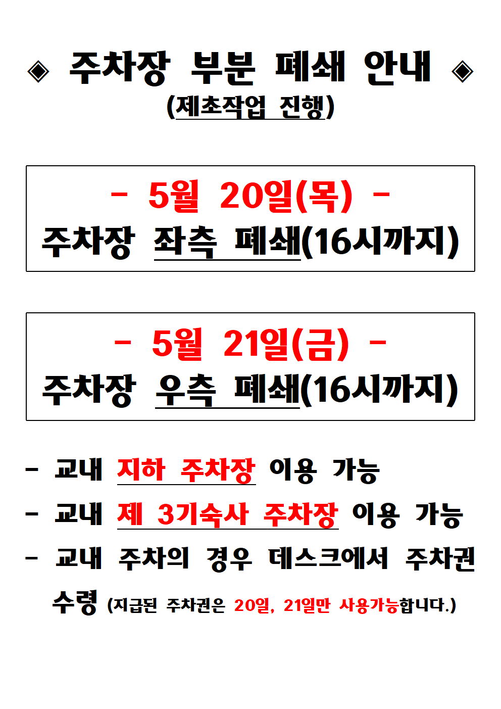 주차장 부분 폐쇄 안내- 제초작업 작성자 관리자 작성일 2021년 5월 19일 17시 37분 9초 조회 1,075 ◈ 주차장 부분 폐쇄 안내-1 ◈001.png [ Size : 55.77KB, Down : 1,193 ] 미리보기 다운로드 제초작업.png [ Size : 316.04KB, Down : 1,145 ] 미리보기 다운로드 목록보기