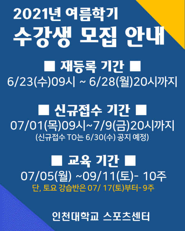 2021년 여름학기 수강생 모집 일정 안내 작성자 관리자 작성일 2021년 6월 21일 12시 13분 18초 조회 1,881 팝업-공지-1.png [ Size : 135.87KB, Down : 2,806 ] 미리보기 다운로드 목록보기