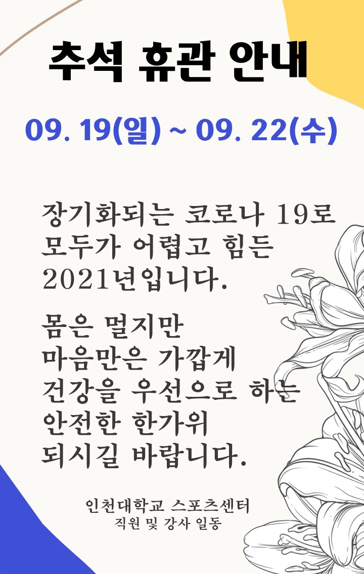 추석 휴관 안내 작성자 관리자 작성일 2021년 9월 17일 11시 40분 20초 조회 1,258 안내 문구-2021.09.07.jpg [ Size : 144.65KB, Down : 1,455 ] 미리보기 다운로드 목록보기