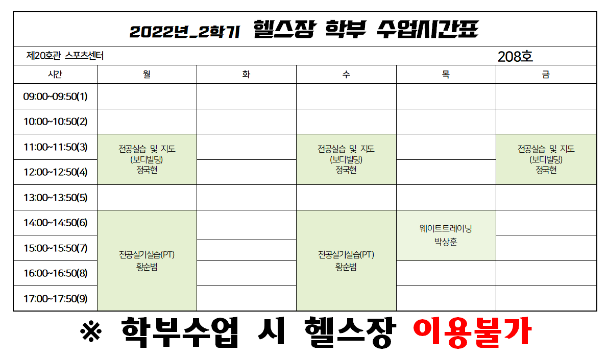 2학기 학부수업 안내(헬스장) 작성자 관리자 작성일 2022년 8월 30일 18시 37분 40초 조회 1,043 헬스장.png [ Size : 41.6KB, Down : 1,456 ] 미리보기 다운로드 목록보기