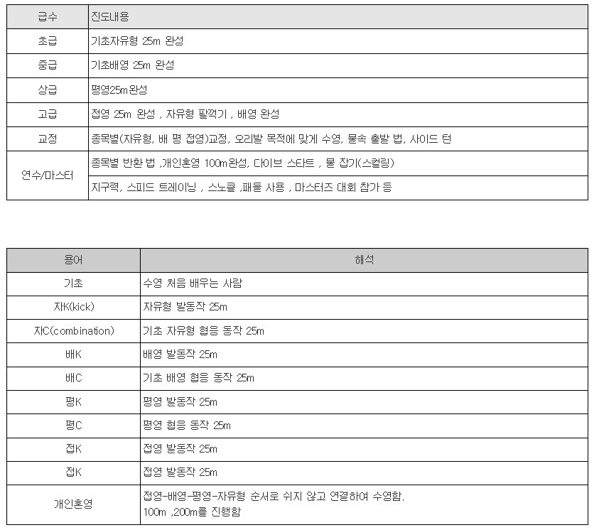 수영 수강 신청 전 반드시 모집요강의 진도 및 급수를 확인하시고 해당 반에 신청하시기 바랍니다.