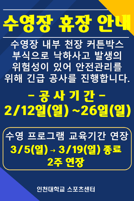 2월 수영장 휴장 안내(수영장 내부 공사) 작성자 관리자 작성일 2023년 1월 31일 18시 2분 5초 조회 1,521 [크기변환]슬라이드1.PNG [ Size : 117.81KB, Down : 1,909 ] 미리보기 다운로드 목록보기