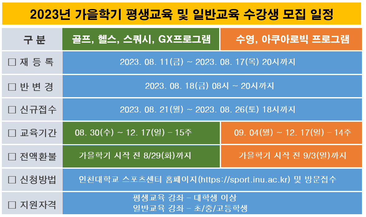 2023년 가을학기 접수 일정안내 작성자 관리자 작성일 2023년 8월 10일 13시 24분 22초 조회 2,089 20230807_170625.png [ Size : 76.92KB, Down : 3,574 ] 미리보기 다운로드 ※ 수영 수강신청 시 추후 공지되는 모집요강의 급수 및 진도를 잘 확인하시고 해당 반에 신청바랍니다. 개강 후 오리엔테이션 진행 시 급수 및 진도가 맞지 않는 경우 환불조치 됩니다.(환불규정에 의해 공제금액 발생합니다.) 목록보기