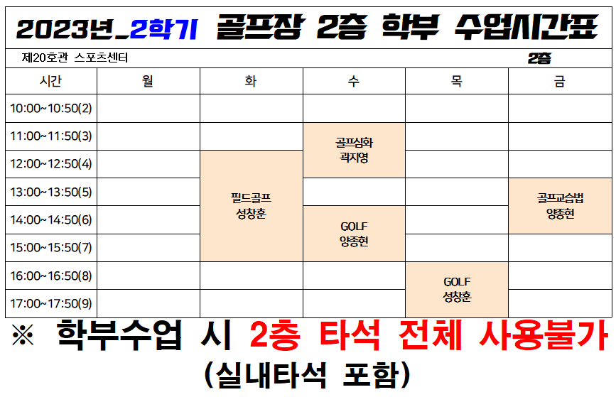 2학기 골프연습장 학부 수업시간 작성자 관리자 작성일 2023년 9월 4일 10시 11분 42초 조회 1,130 20230904_100935.png [ Size : 32.15KB, Down : 1,218 ] 미리보기 다운로드 2학기 골프연습장 학부 수업시간 안내입니다. 이용에 참고바랍니다. 목록보기
