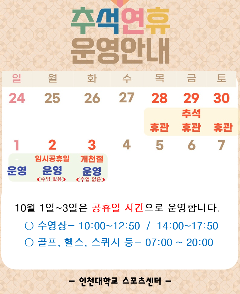 추석 연휴기간 스포츠센터 운영 안내 작성자 관리자 작성일 2023년 9월 26일 13시 12분 6초 조회 1,195 258.png [ Size : 797.23KB, Down : 1,247 ] 미리보기 다운로드 목록보기