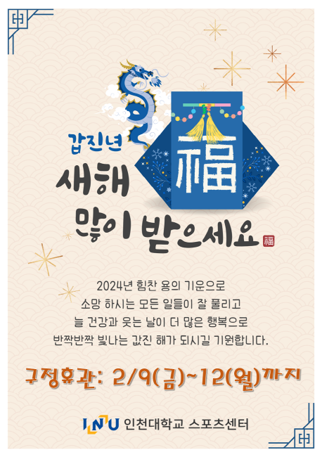 구정 휴관 안내 작성자 관리자 작성일 2024년 1월 31일 18시 23분 40초 조회 844 구정 휴관 안내.PNG [ Size : 294.51KB, Down : 895 ] 미리보기 다운로드 목록보기