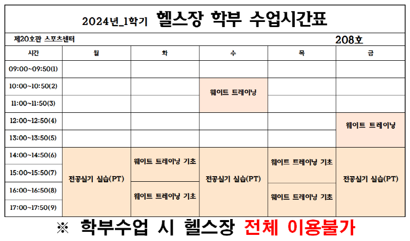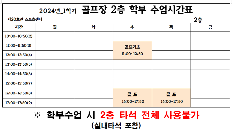 2024년 1학기 골프장 및 헬스장 학부 수업 안내 작성자 관리자 작성일 2024년 2월 20일 15시 56분 46초 조회 1,686 [크기변환]헬스장 학부시간표.png [ Size : 74.56KB, Down : 1,606 ] 미리보기 다운로드 [크기변환]골프 학부수업시간표.png [ Size : 61.9KB, Down : 1,586 ] 미리보기 다운로드 목록보기